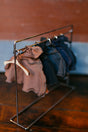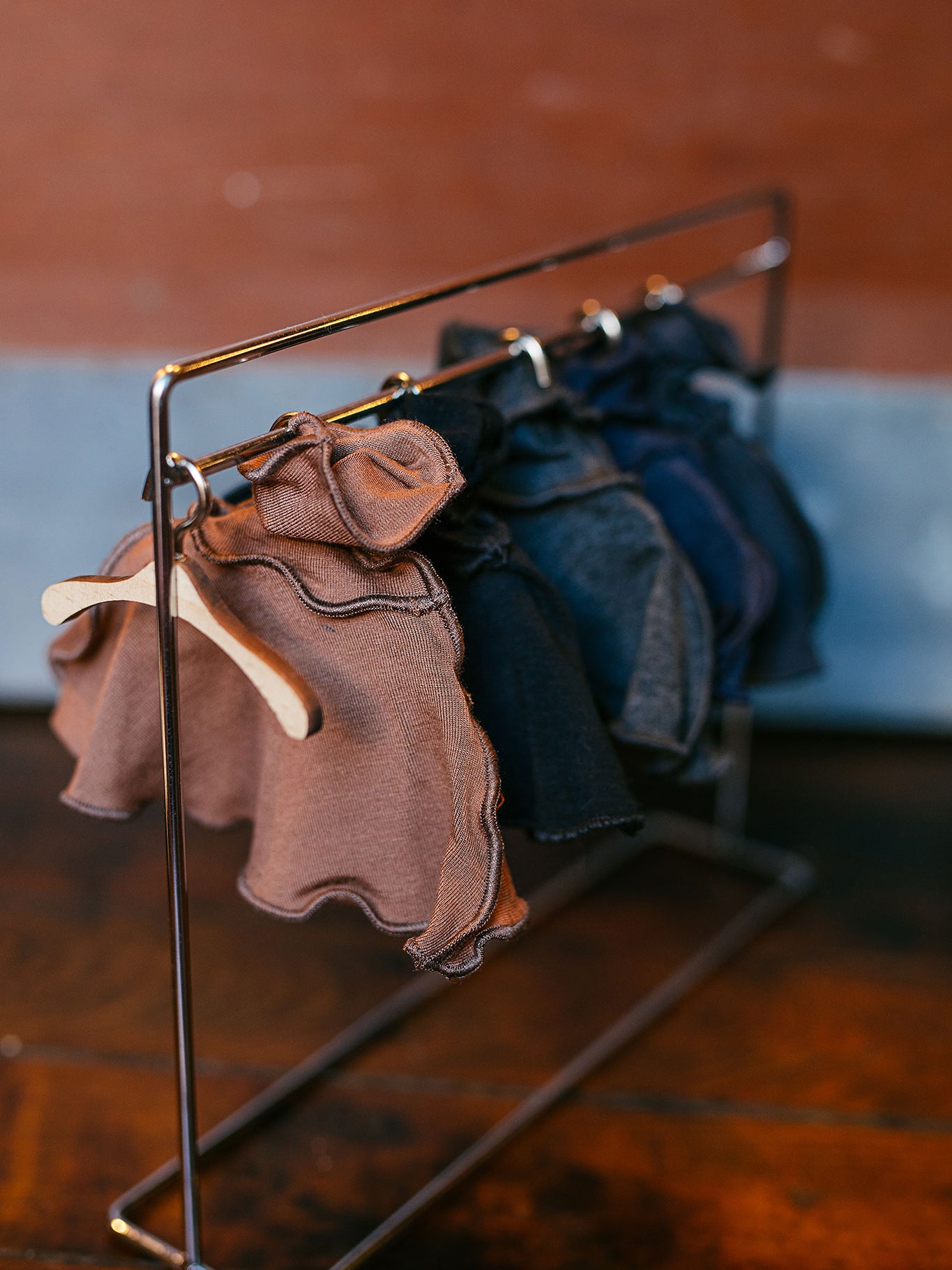 La mejor manera de colgar Angelrox es en perchas flocadas que ahorran espacio para minimizar la deformación o el daño que pueden causar los bordes afilados de las perchas de madera y metal. Es preferible no usar perchas inferiores con clips que puedan dejar impresiones en nuestras telas de felpa. Estas impresiones se lavarán, pero creemos que es mejor no tenerlas en primer lugar.
