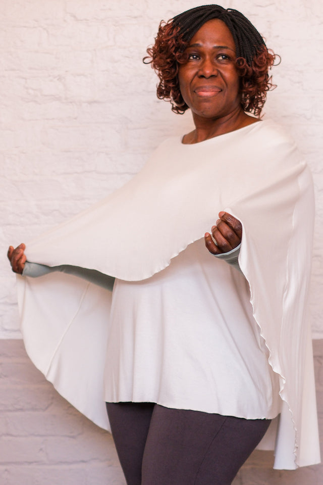 et notre joli nouveau haut tunique élégant. spacieux et confortable, le corps carré généreux du mantra permet de superposer des couches et de laisser passer la brise. la cape asymétrique flotte comme un rêve et couvre les bras. ou jetez la cape en arrière pour une belle coque sophistiquée sans manches. enfilez-la avec un CRAYON, des bottes et c'est parti !