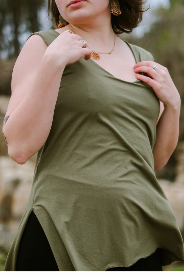 we design a lot of our fitted tops with extra length to be gathered or ruched over the tummy or waistbands for flattering texture and lovely way to enjoy.